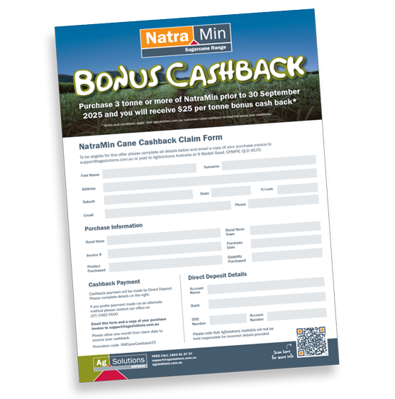 Download the claim redemption form (here). All details are to be completed and returned to AgSolutions Australia prior to 30 September 2025 to be eligible for this offer. Use the promotion code: NMCaneCashback25
